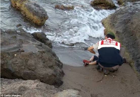 9月2日,3歲男童遺體被沖上土耳其海岸的照片讓整個(gè)歐洲心碎。照片中的男孩身穿紅色T恤和短褲,面部朝下趴在沙灘上。
