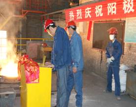 2012年7月7日上午11點零19分,青海物產(chǎn)工業(yè)投資有限公司10萬噸電解鋁/年升級改造項目,簡易陽極組裝車間大門前鞭炮齊鳴。青海物產(chǎn)工業(yè)投資有限公司黨總支副書記、青海長春炭素有限公司總經(jīng)理王松華,公司常務(wù)副總經(jīng)理、項目副總指揮常海寧,工業(yè)投資和長春炭素公司副總經(jīng)理姜紅萍,公司副總經(jīng)理張秉瑜,總經(jīng)理助理范登福等公司領(lǐng)導(dǎo)和各車間、部室的職工出席了簡單的點火澆鑄儀式。王松華同志按下了點火按鈕鄭重宣布澆鑄正式開始。當(dāng)中頻爐工將第一爐鐵水倒入抬包時,標(biāo)志著新陽極組裝車間正式投產(chǎn)運行。